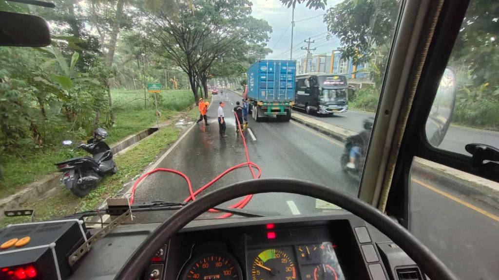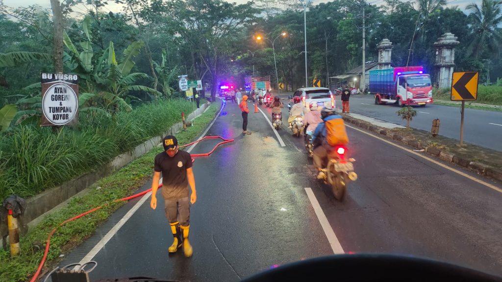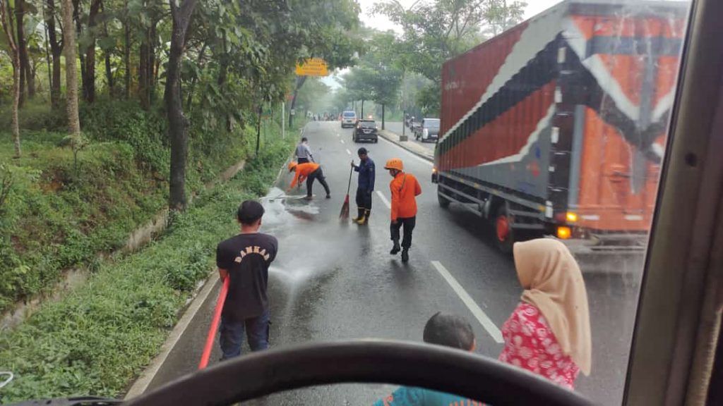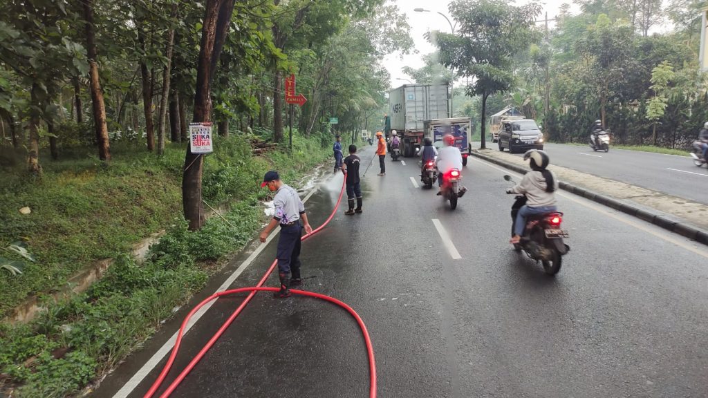 Salatiga – Jumat, 14 April 2023 Damkar Salatiga melakukan penyemprotan jalan di JLS Salatiga akibat dari tumpahan oli yang dapat membahayakan pengguna jalan. Warga yang mengetahui adanya tumpahan oli langsung menghubungi Damkar Kota Salatiga lewat nomor layanan Whatsapp 0888 3322 106. Segera personil langsung bergerak ke lokasi dimaksud dan melakukan pembersihan jalan dari tumpahan oli. Pembersihan ini melibatkan Damkar Salatiga, BPBD Kota Salatiga, Polres salatiga. Kegiatan berjalan lancar.