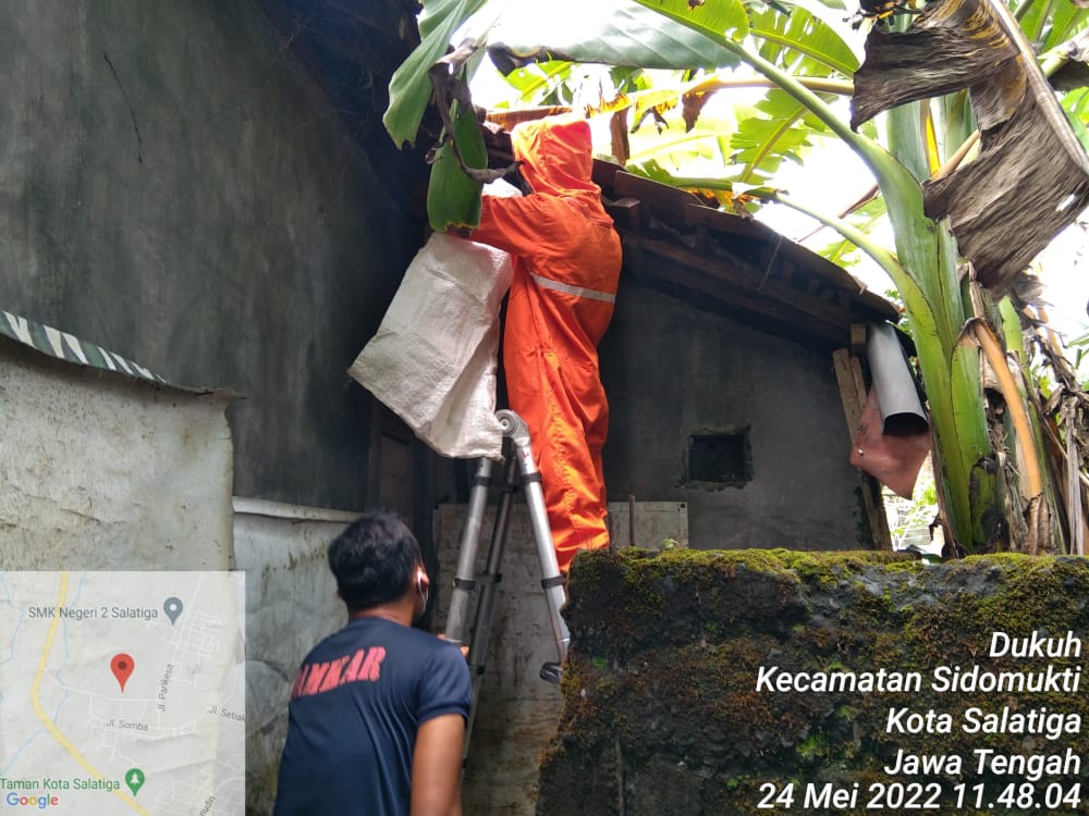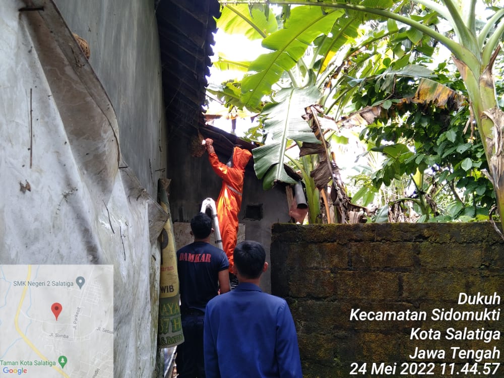 Salatiga – Selasa 24 Mei 2022 Damkar Salatiga melakukan evakuasi sarang tawon di Warak RT.07 RW. 06 Kelurahan Dukuh Kecamatan Sidomukti berdasar laporan warga Bapak Mulyono pada pukul 11.15 wib. Sarang tawon berhasil dievakuasi oleh petugas. Personil terlibat adalah Regu 1 Damkar Kota Salatiga, Kabid Pemadam Kebakaran, Kasi Pemadaman dan Penyelamatan, Kasi Pencegahan dan Inspeksi beserta staf pemadam kebakaran. Kegiatan berjalan aman dan lancar.