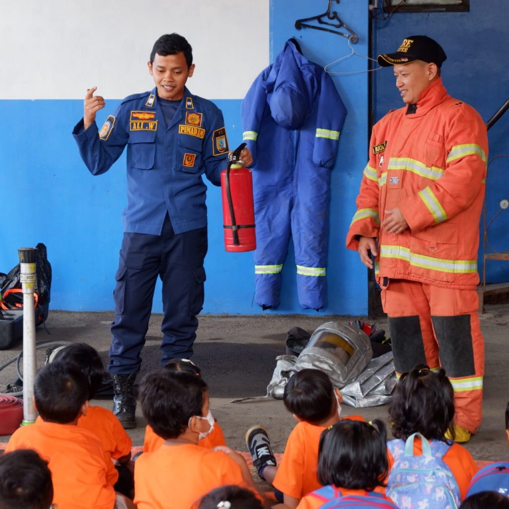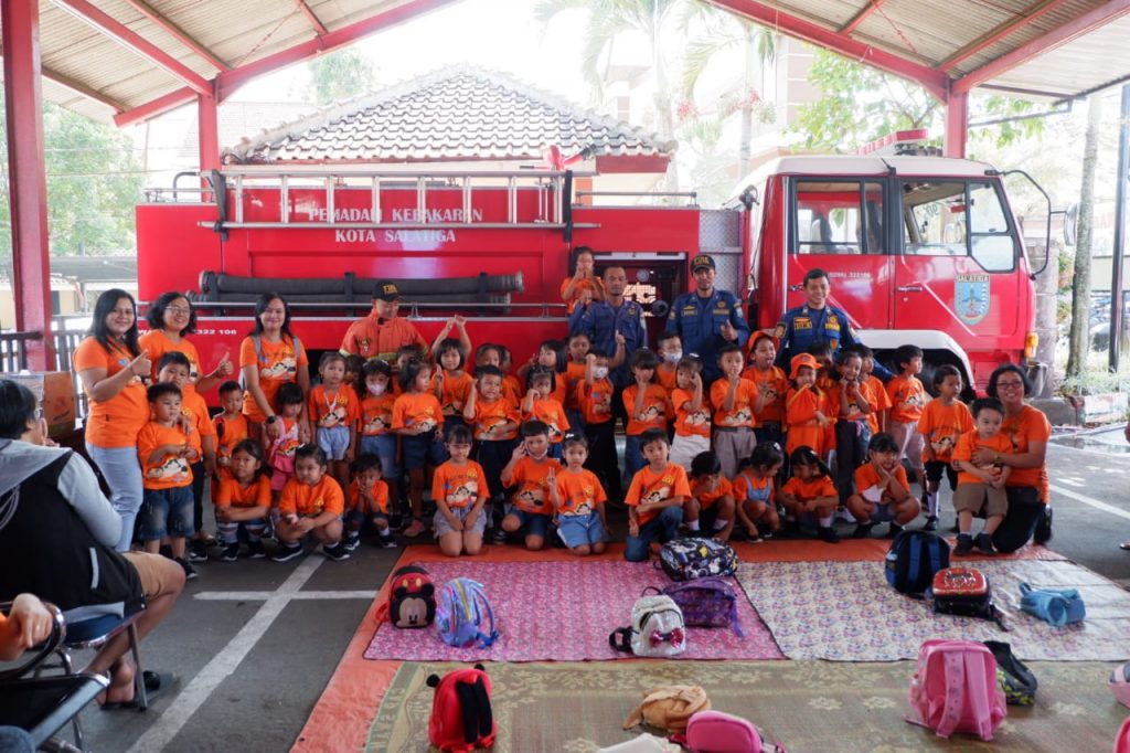 Salatiga – Jum’at / 15 September 2023 Bidang Damkar pada Satpol PP Kota Salatiga beralamat di Jalan A. Yani No 14 Salatiga melakukan kegiatan pengenalan profesi dan peralatan pemadam kebakaran atas kunjungan 45 siswa dan 10 Pendamping dari KB/ TK Marsudirini Sang Timur. Kegiatan dimulai pada pukul 08.00 WIB. Selain menyampaikan profesi dan peralatan pemadaman kebakaran juga dilakukan simulasi penyemprotan memakai alat pemadam kebakaran dan berkeliling menggunakan kendaraan damkar. Hadir dalam kegiatan ini Kepala Bidang Pemadam Kebakaran Joko Widodo, S.T.,M.M., Pelaksana harian Kepala Seksi Pemadaman dan Penyelamatan Sigit Sumbogo, S.Sos., dan beberapa personil Damkar.