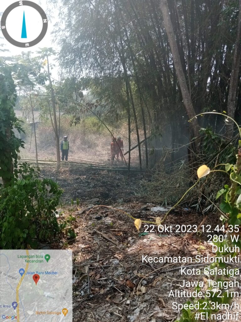 Jalan Bisma Kelurahan Dukuh RT. 01/RW. 02 Kecamatan Sidomukti via nomor Wa damkar Salatiga.Kebakaran kemungkinan disebabkan oleh puntung rokok yang dibuang sembarangan. Bersama sama memadamkan api dari unsur Damkar Salatiga, BPBD Salatiga dan beberapa warga.