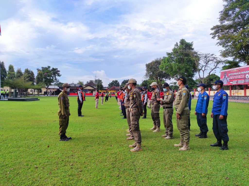 Salatiga-Minggu, 1 Mei 2022 pukul 16.30 Satpol PP Kota Salatiga mengikuti giat apel persiapan pengamanan takbir Idul Fitri 1443 Hijriah Tahun 2022 di Polres Salatiga. Apel diikuti oleh unsur Polres Salatiga, Kodim 0714/Salatiga, Satpol PP, dan Dinas Perhubungan Kota Salatiga.