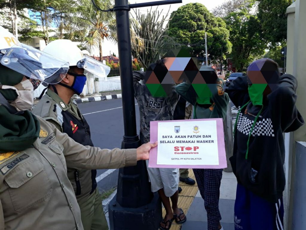 “mereka yang tidak pakai masker langsung kita tegur dan kita beri sanksi edukatif untuk berjanji selalu pakai masker” kata salah satu personil Satpol PP Kota Salatiga saat bertugas di lapangan.