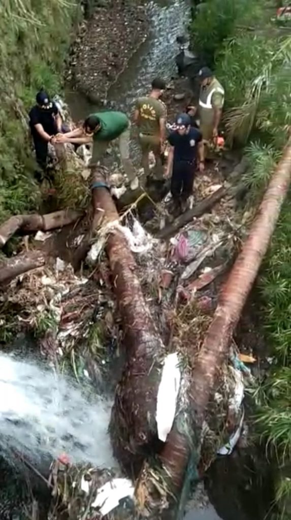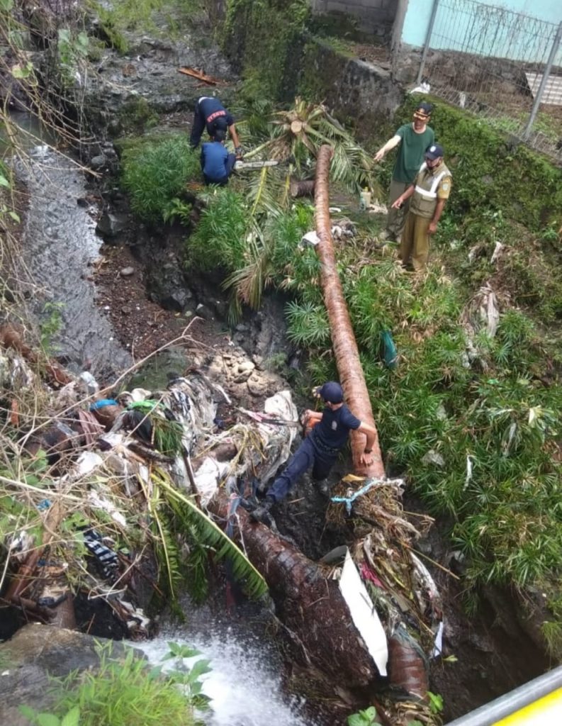 Karena itu Satpol PP pada hari Senin (7/12/2020) segera meluncur ke tempat kejadian dan terlihat pohon kelapa dan sengon yang roboh serta terbawa derasnya air yang berakibat aliran air sungai terhalang atas robohan pohon tersebut.
