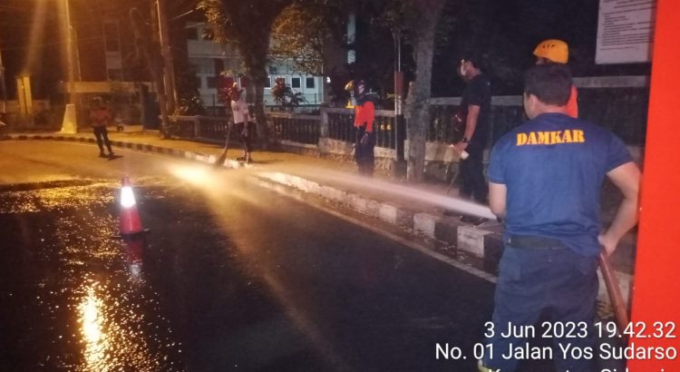 Damkar Bersihkan Tumpahan Oli di Cungkup